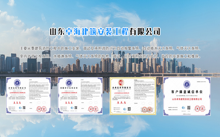 公司具備消防設施工程專業承包貳級資質、建筑機電安裝工程專業承包叁級及施工勞務資質,公司擁有一支高素質、技術過硬、經驗豐富的專業施工隊伍,主要從事建筑消防工程中的施工安裝、調試及承擔消防火災自動報警系統、自動噴水滅火系統、氣體滅火系統、室內外消火栓系統、水噴淋系統、氣體滅火系統的檢修、調試,同時承擔安防及監控、監控的安裝施工和維保。